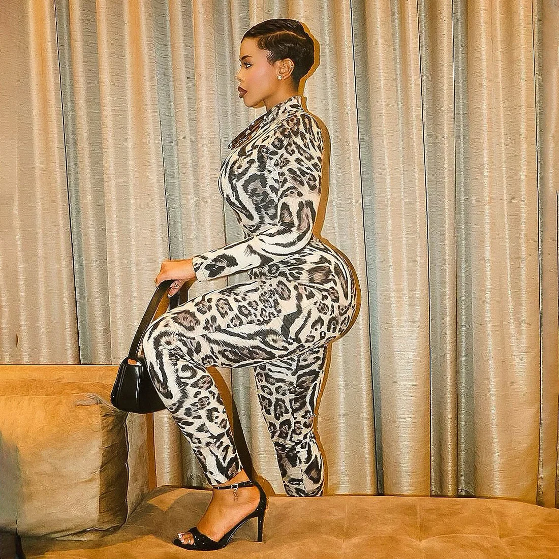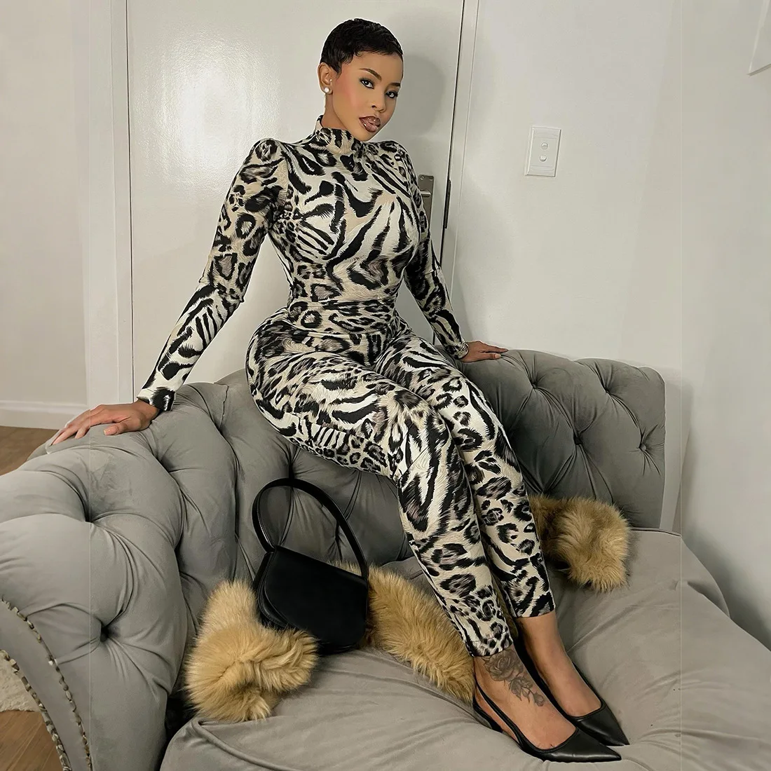 C1144 Fall New Women's Fashion Leopard Print Long Sleeved Semi High Neck Sports Bodycon Jumpsuit